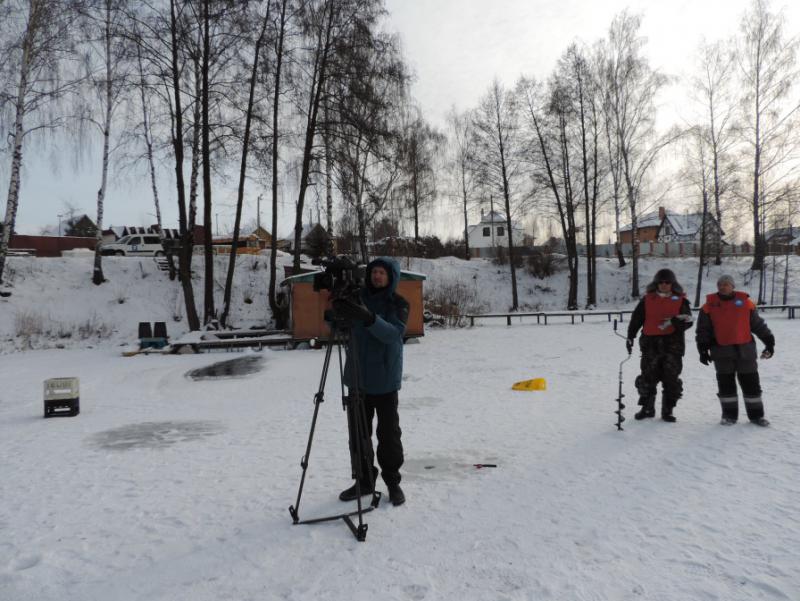 Все рыбачки сидели на основной, мы же с Михалычем планы менять не стали и в 9-30 вылезли на лед ВИПа, расставили 5 желиц с разной пастой и креветкой, Михалычу соорудили нехитрую активно-пассивную снасть в виде микроджиговой 4-ех граммовой чебурашки с застежкой и крючком с подсадкой креветки, я же зацепил вильямса и начали колдовать. Первые полчаса рыбалки показали, что если у форы и была какая то утренняя активность, то мы её благополучно профукали и отловиться за два часа не получится, к 11-00 у нас в активе были один пойманный тестем хвост и невнятный тычек на мой вильямс, флаги на жерлах загораться совсем не хотели. На основной у ребят похожая вялотекущая движуха. Да уж, давление 770мм.рт.ст. рыба видимо в ступоре. Попробовал погонять силикон, тоже не работает. Тут как раз подкатило телевидение.