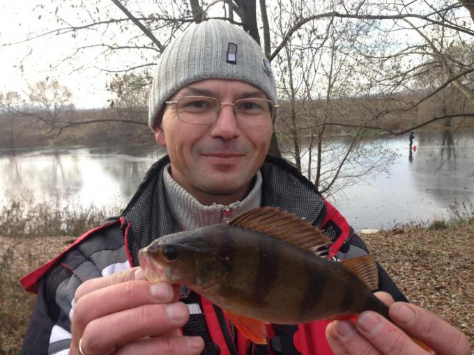 В общем Саня в целом все изложил, но немного подробностей от меня. Лёд прозрачный, глубина небольшая, окунь весьма осторожный, но если получалось "раскачать" лунку на "серию", то полосатый в азарте терял страх и весьма неплохо клевал, хотя основная масса поклёвок всё равно была весьма осторожной и зачастую окунь просто "подвисал" без удара. Я ловил исключительно на блесны, точнее на одну блесну, двухстороннюю "лыжу" 35мм ручной работы с подвесным тройником. Лучший результат давал прием облова лунки начиная с верхнего горизонта и постепенно опускаясь ко дну, нередко окунь клевал практически из подо льда.